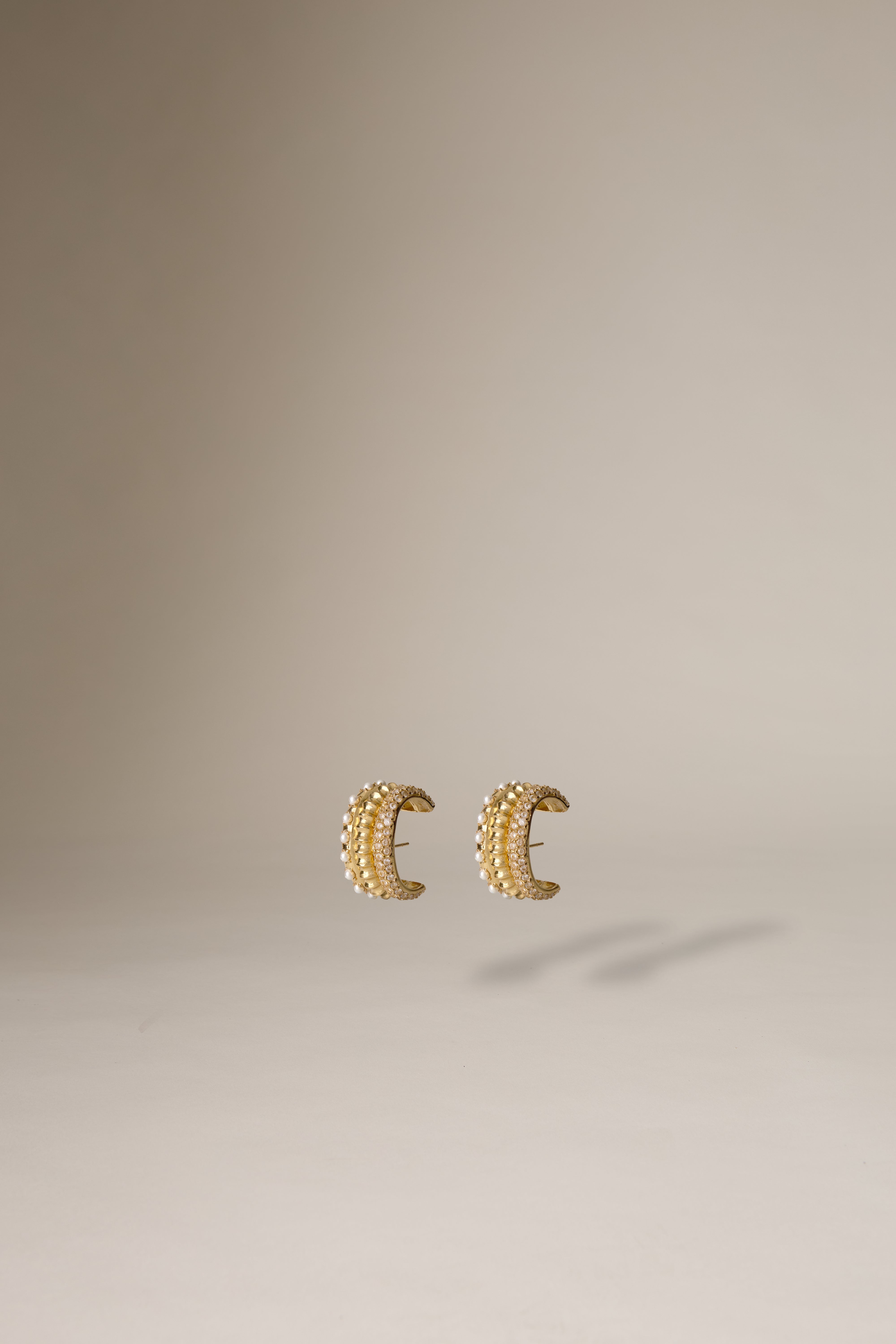 Chato Studio's earrings are meticulously hand-hammered using the house's craftsmen secret technique to achieve a stippled finish. They're cast from gold brass and set with an exquisite collection of rose cut crystal for a magnificent sparkle with pearls.