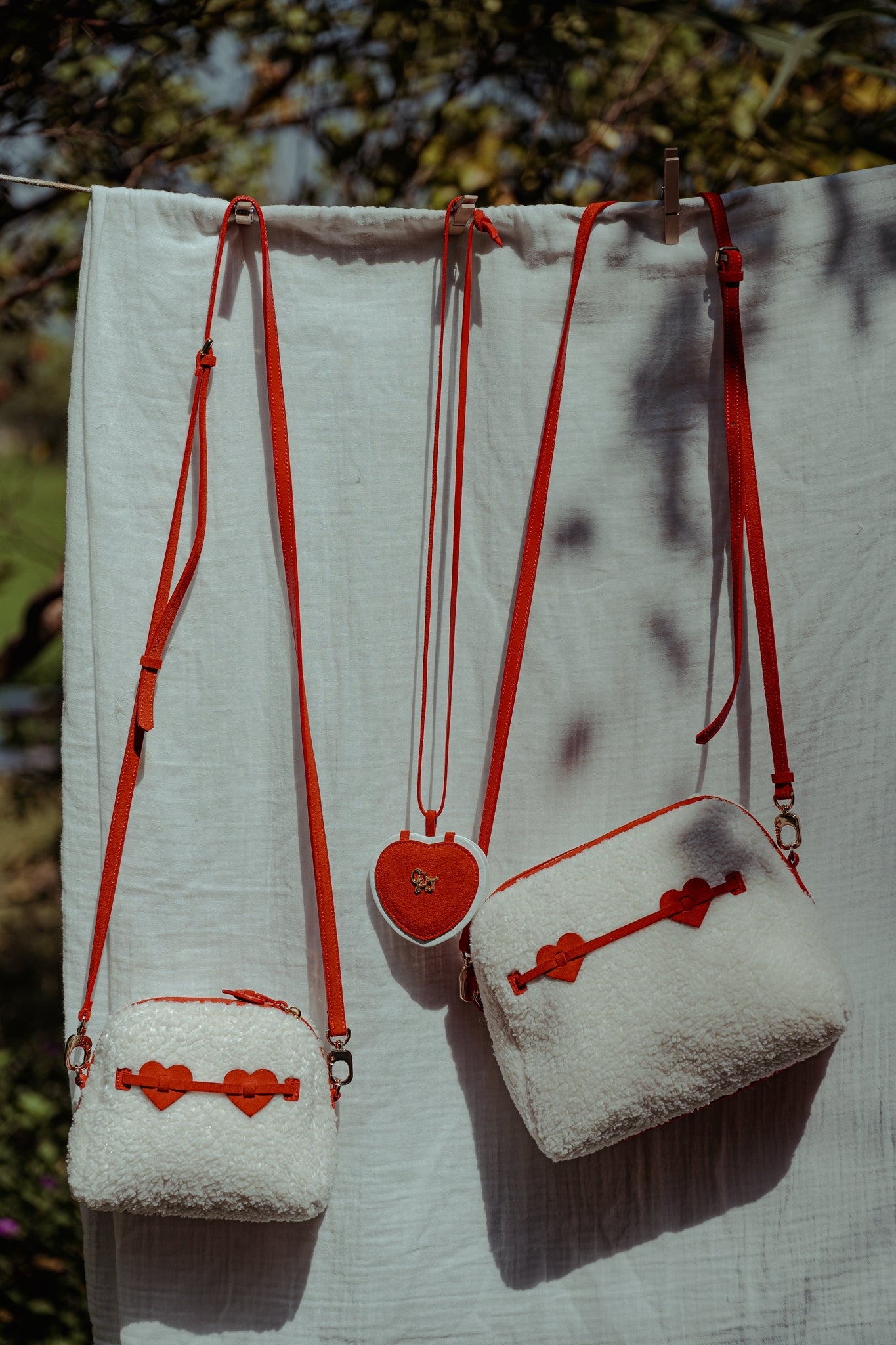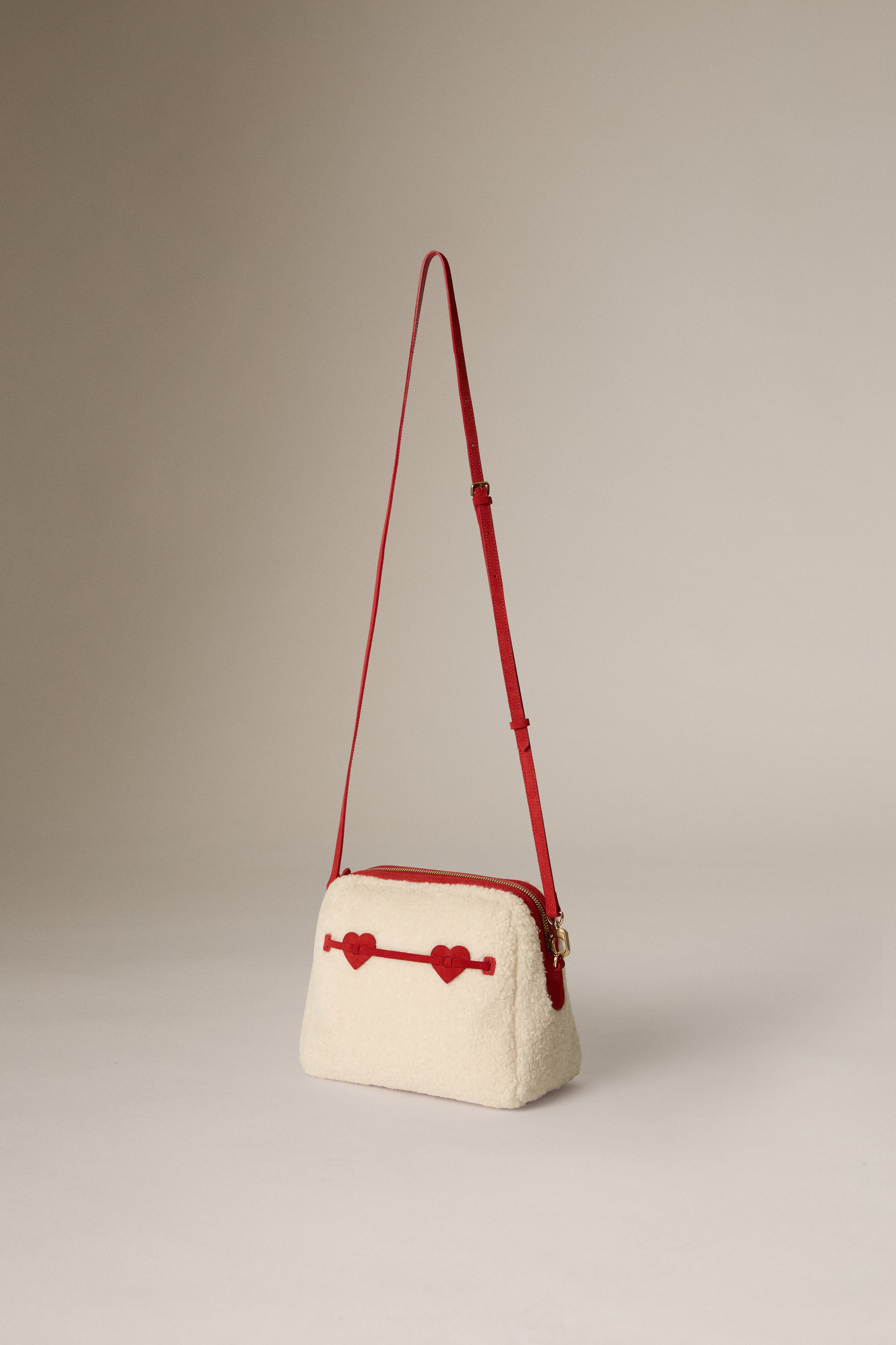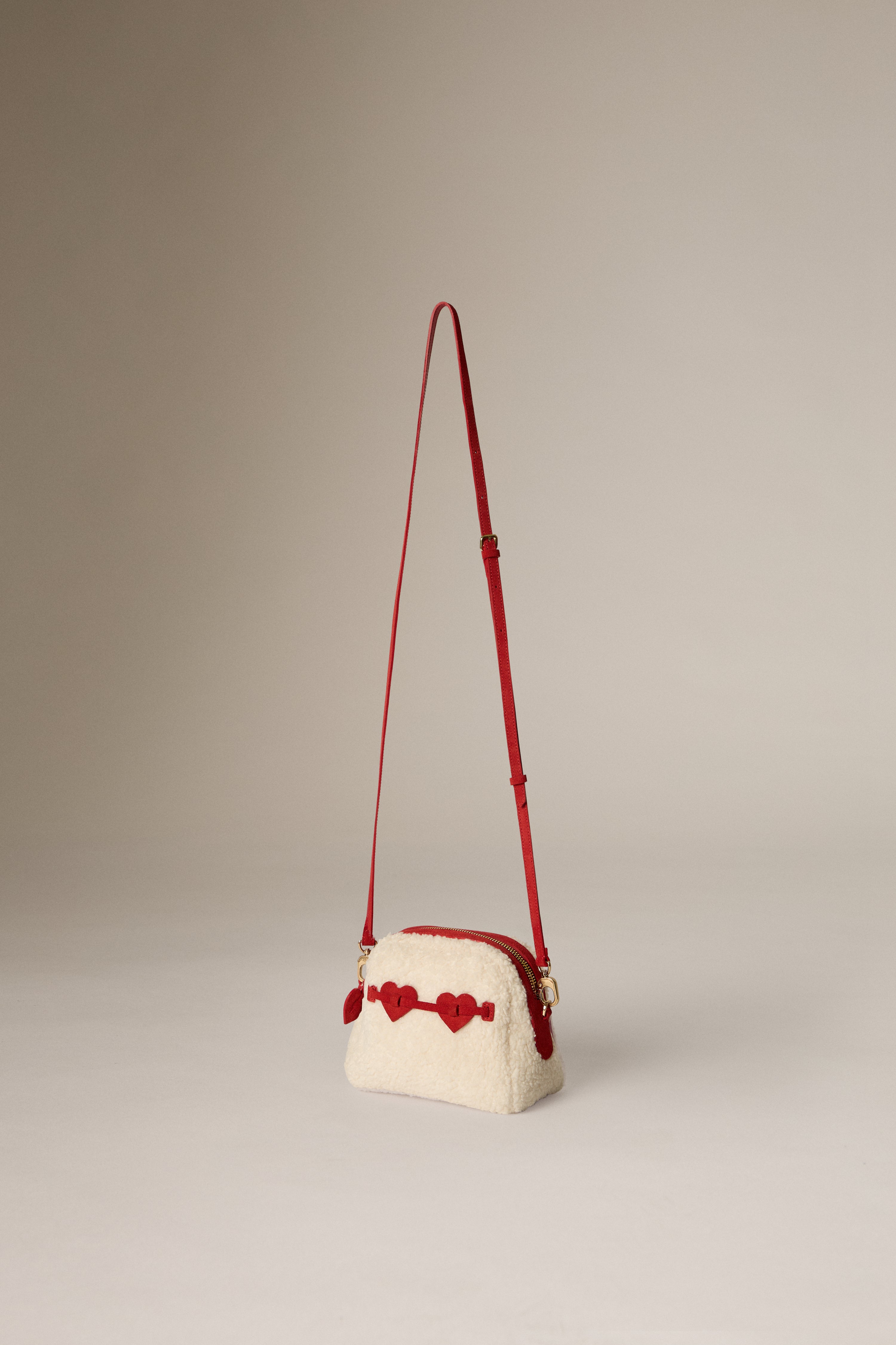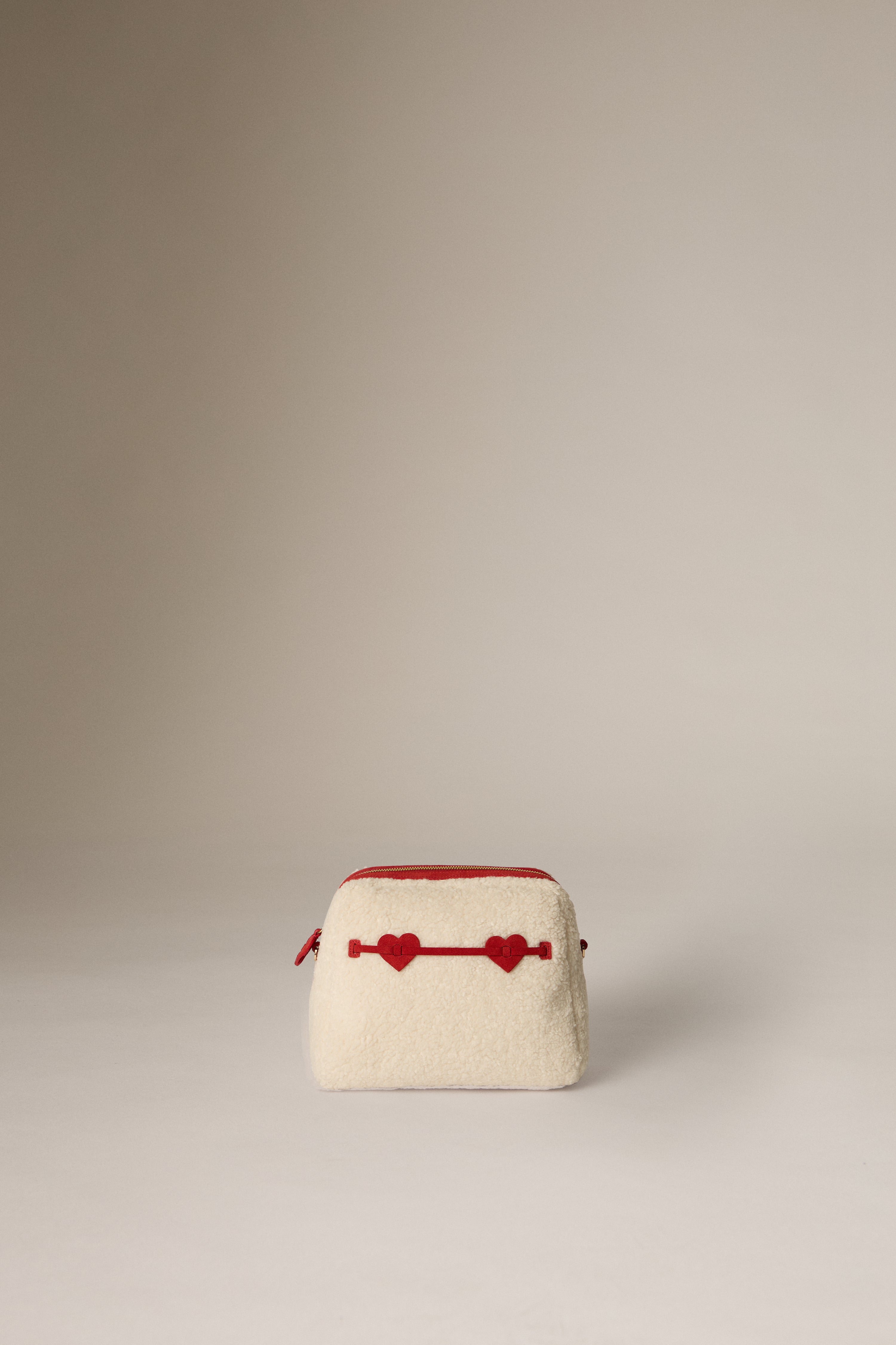 Fluffy donut pouch bag is made from huggable matelassé shearling trimmed with smooth leather. It comes with heart shape donut straw in the front of the bag as Chato's signature. There's enough space inside for your wallet, phone and keys.