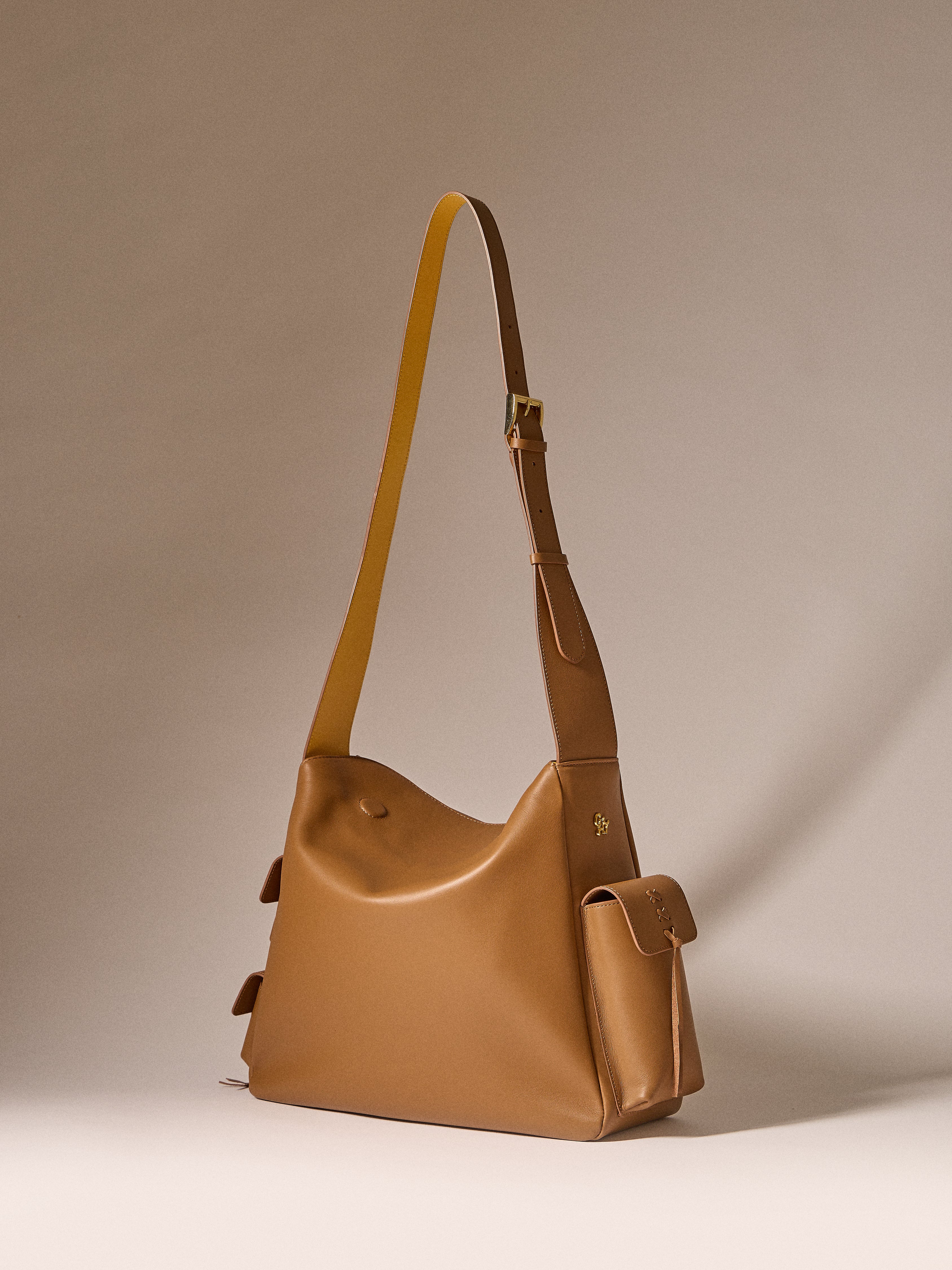 Marrying a timeless aesthetic with modern practicality, this large version is made from soft suede. The exterior on both sides are fitted with cargo pockets and offers enough room for an airpod. The bag has room enough for a wallet, cosmetic, keys, and everyday compact essentials.